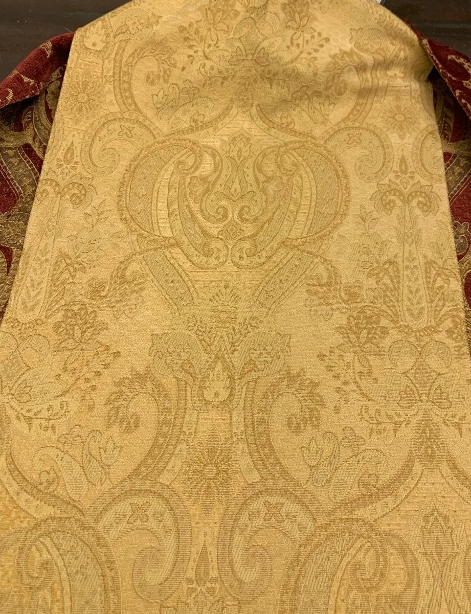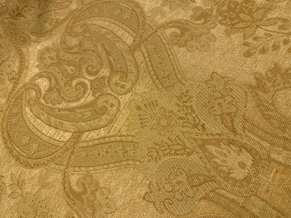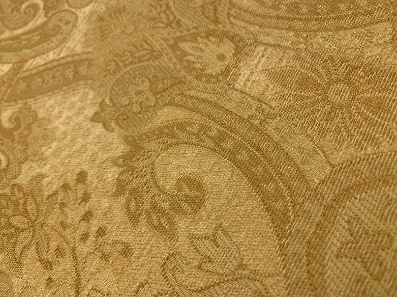 Całość tkaniny utrzymana jest w tonacji jasny złoty z delikatnymi przebłyskami nici ecru, która dodatkowo podkreśla stylowy pałacowy ornament.