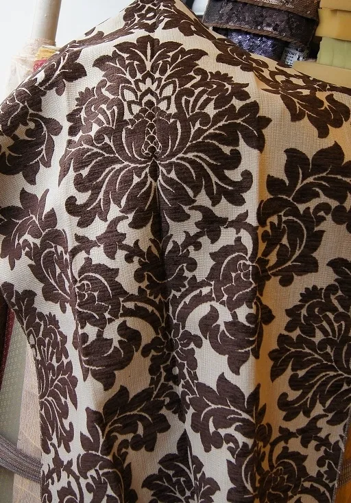Całość tkaniny utrzymana jest w tonacjii beżowo-ecri, który dodatkowo został wzbogacony stylowym ornamentem w kolorze ciemnego brązu.