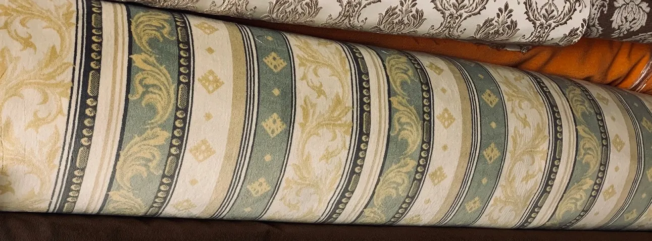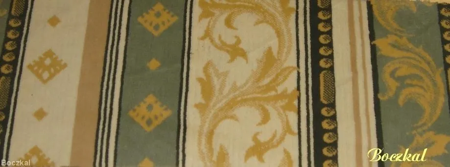 Klasyczna tkanina pluszowa o pięknej i ciekawej barwie, którą wzbogacają pasy w kolorze ciepłej oliwki i jasnego beżu.