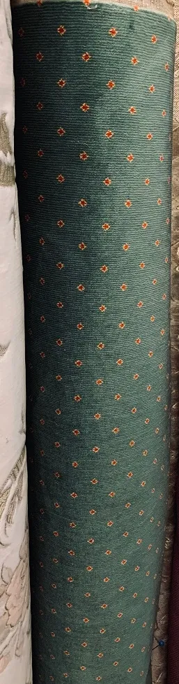 Klasyczna tkanina pluszowa o głębokiej barwie zieleni. Połączenie tła zielonego i delikatnego wzorka czerwieni sprawiają, że tkanina pięknie prezentuje się na krzesełkach, wszelkiego rodzaju siedziskach, a w szczególności do dębowej, ciemnej stolarki krzesła.