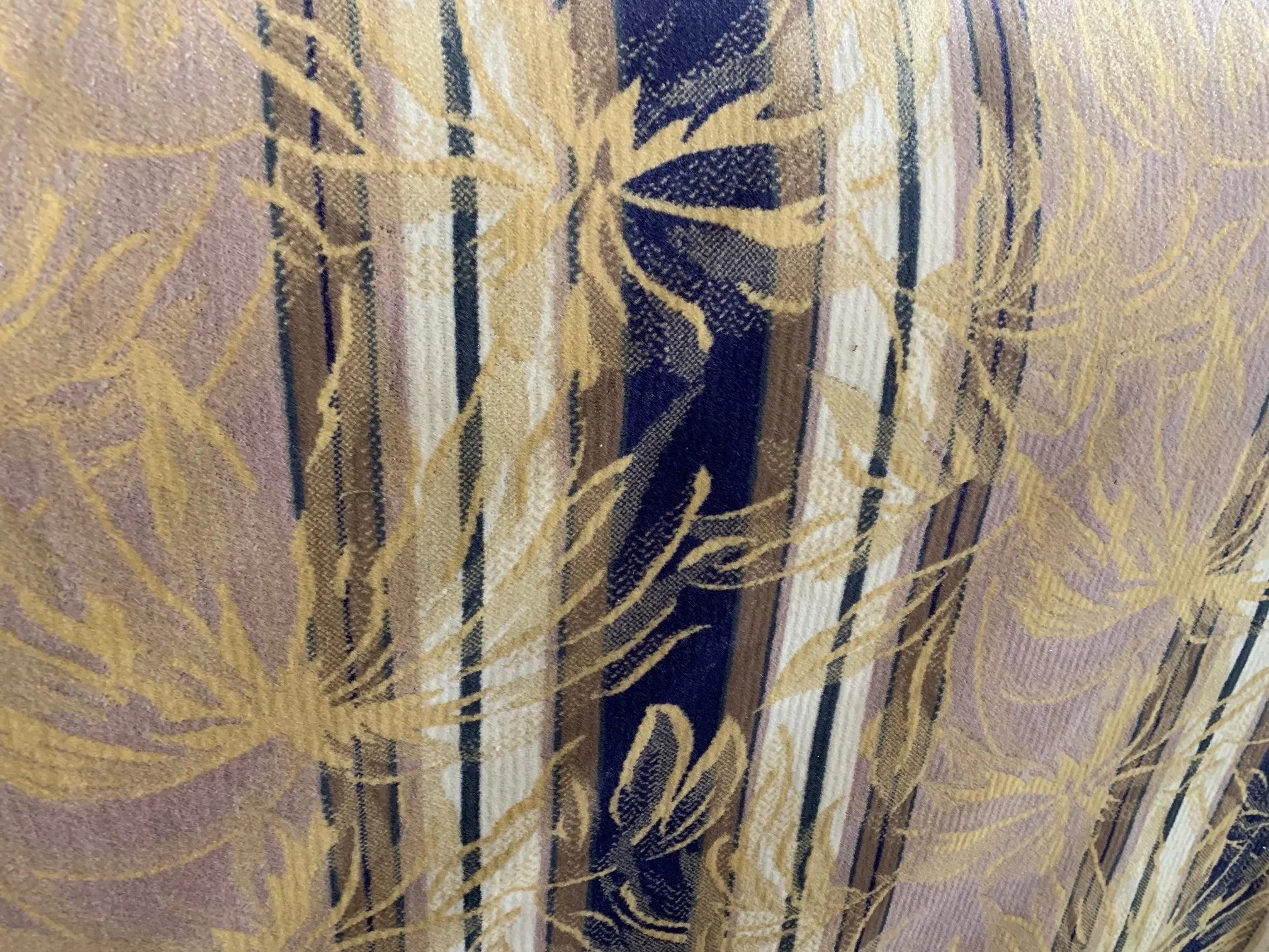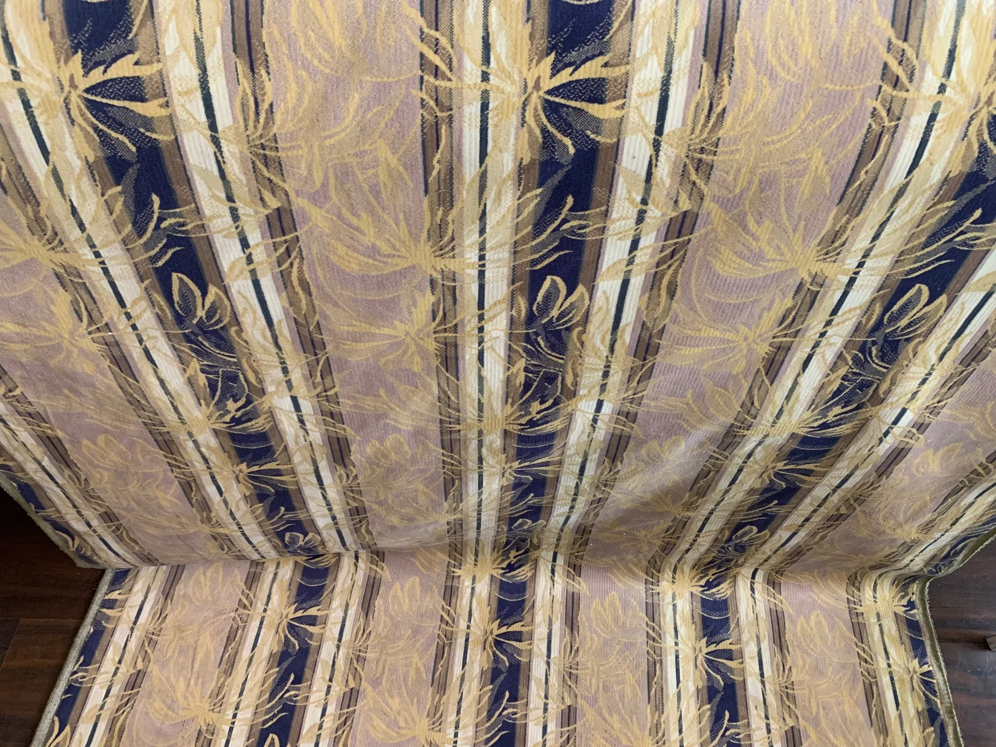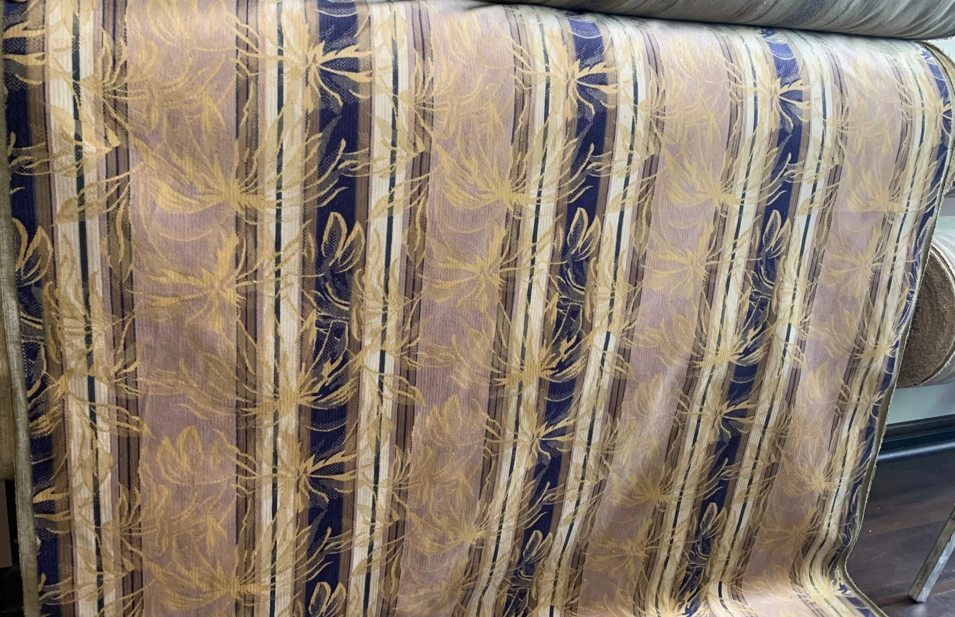 Klasyczna tkanina pluszowa o pięknej i ciekawej barwie, którą wzbogacają pasy w kolorze granatu i jasnego beżu.