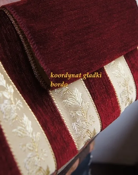 Piękna i elegancka tkanina szenilowa , zachywcająca pięknym blaskiem głębokiego i mieniącego się koloru czerwieni wina. Tkanina podczas dotyku jest niezwykle mięsista, miła, a zarazem bardzo trwała.