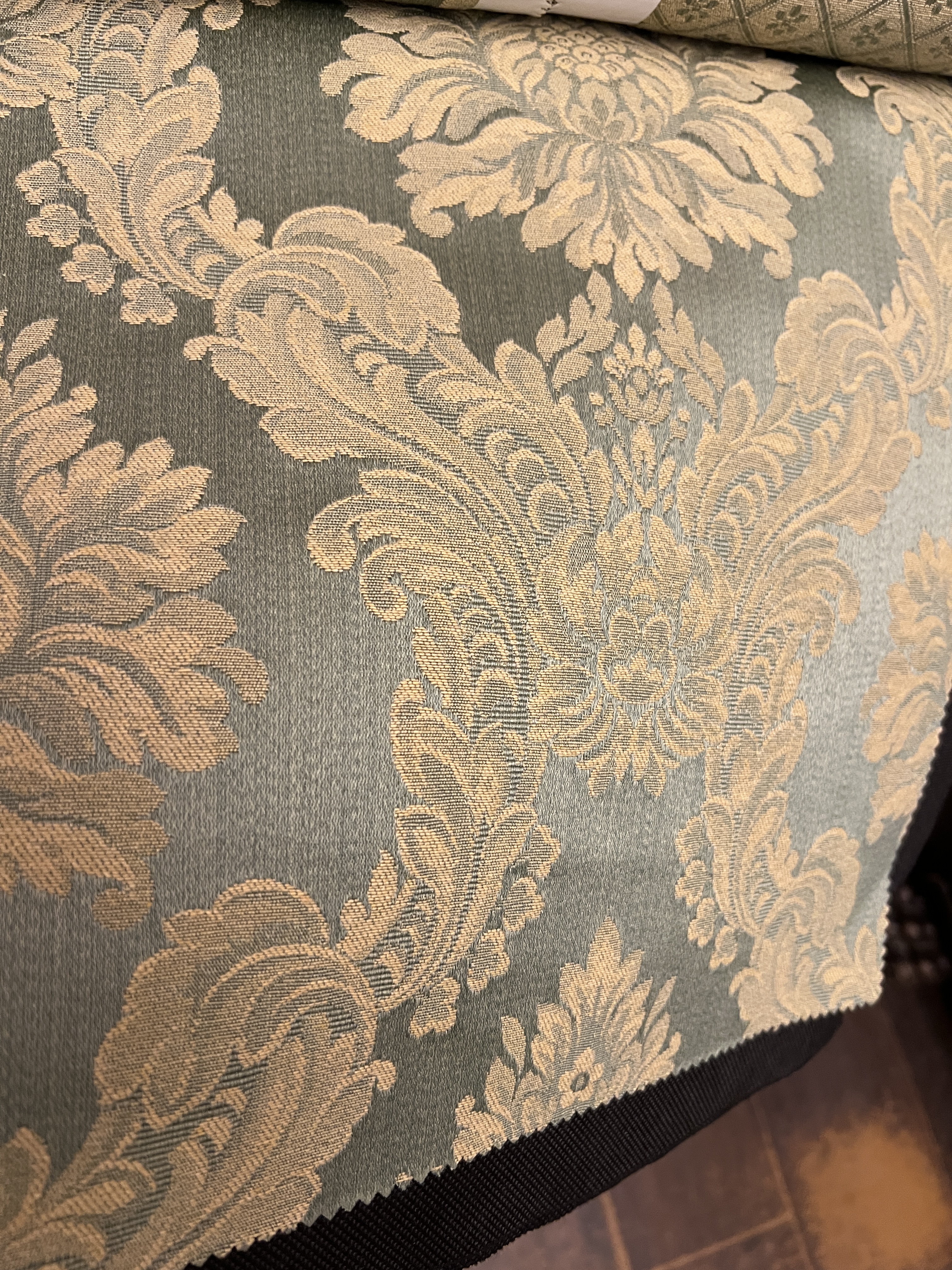 Całość tkaniny utrzymana jest w tonacji oliwkowej, oliwkowo-szałwiowej, której dodatkowym atutem jest stylowy ornament. Bogaty wzór roślinny nawiązuje do tradycyjnych i eleganckich wnętrz rezydencjonalnych . Prezyzyjnie tkany ornament tworzy efekt głębi i szlachetnej struktury , a delikatny połysk podkreśla ekskluzywny charakter materiału.