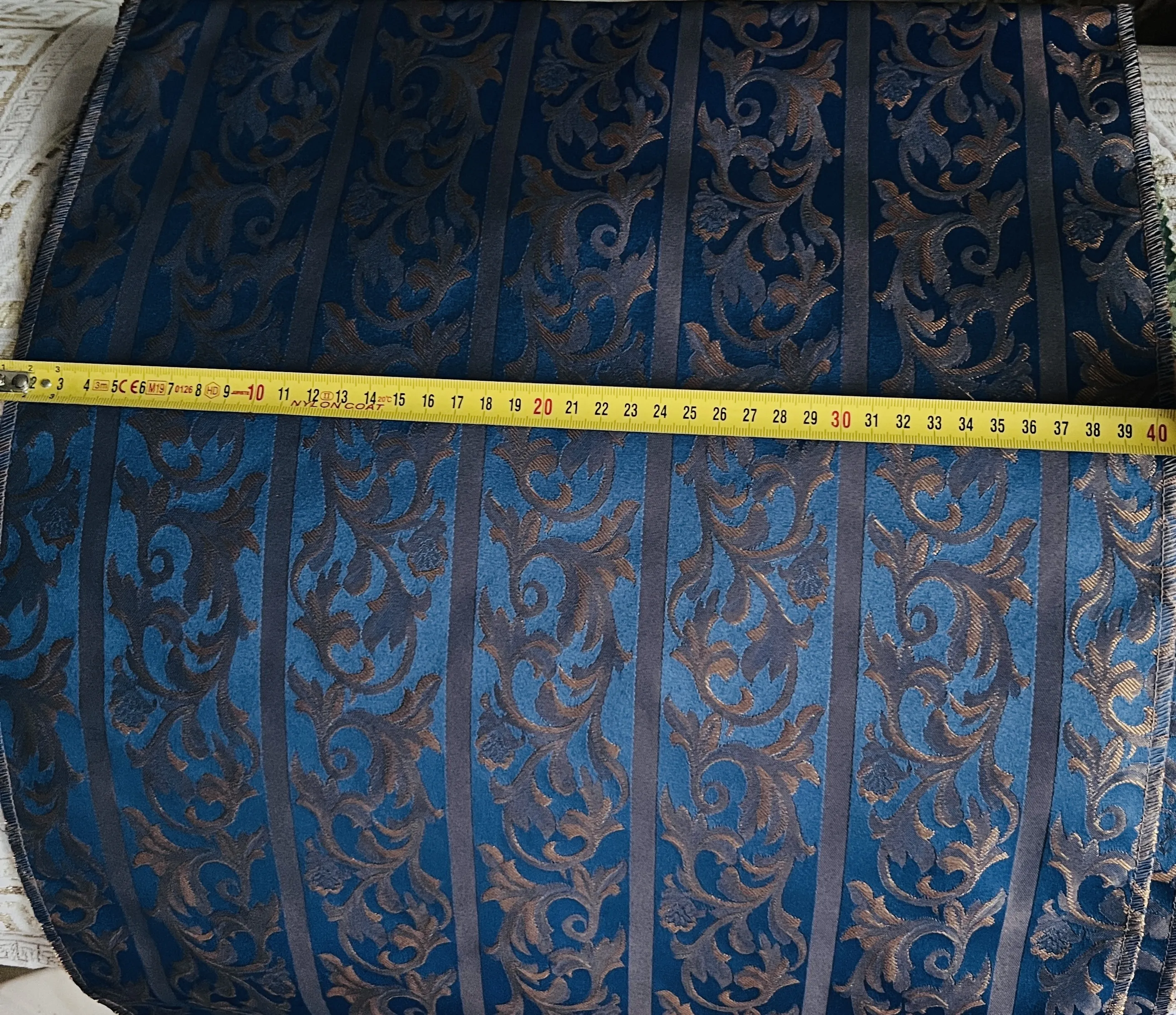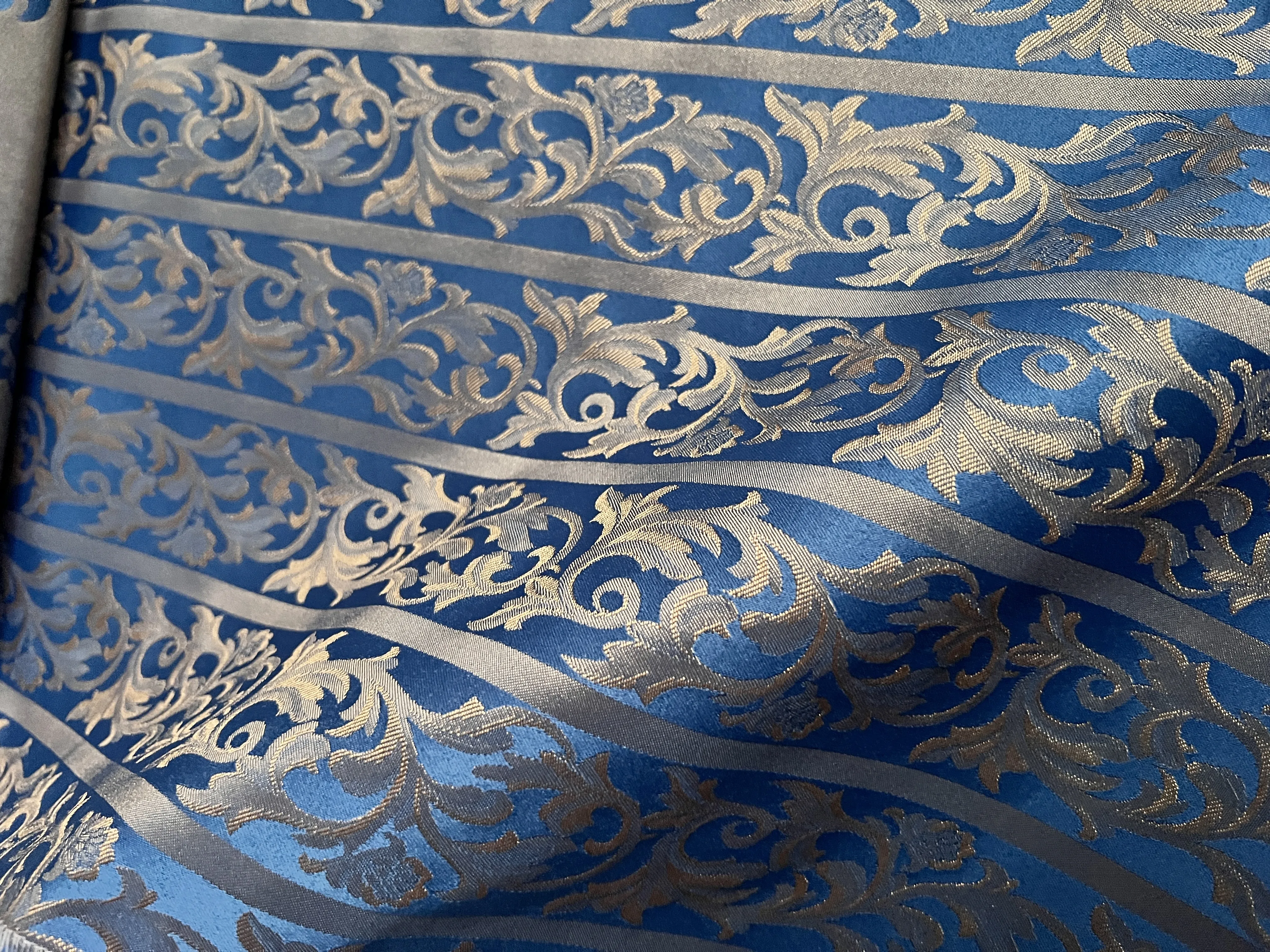 Przedstawione bogate pasy stylowe oraz wzory na tej tkaninie utrzymane są w głębokiem odcieniu chabru, podkreślają elegancję i ponadczasowe piękno tej tkaniny.