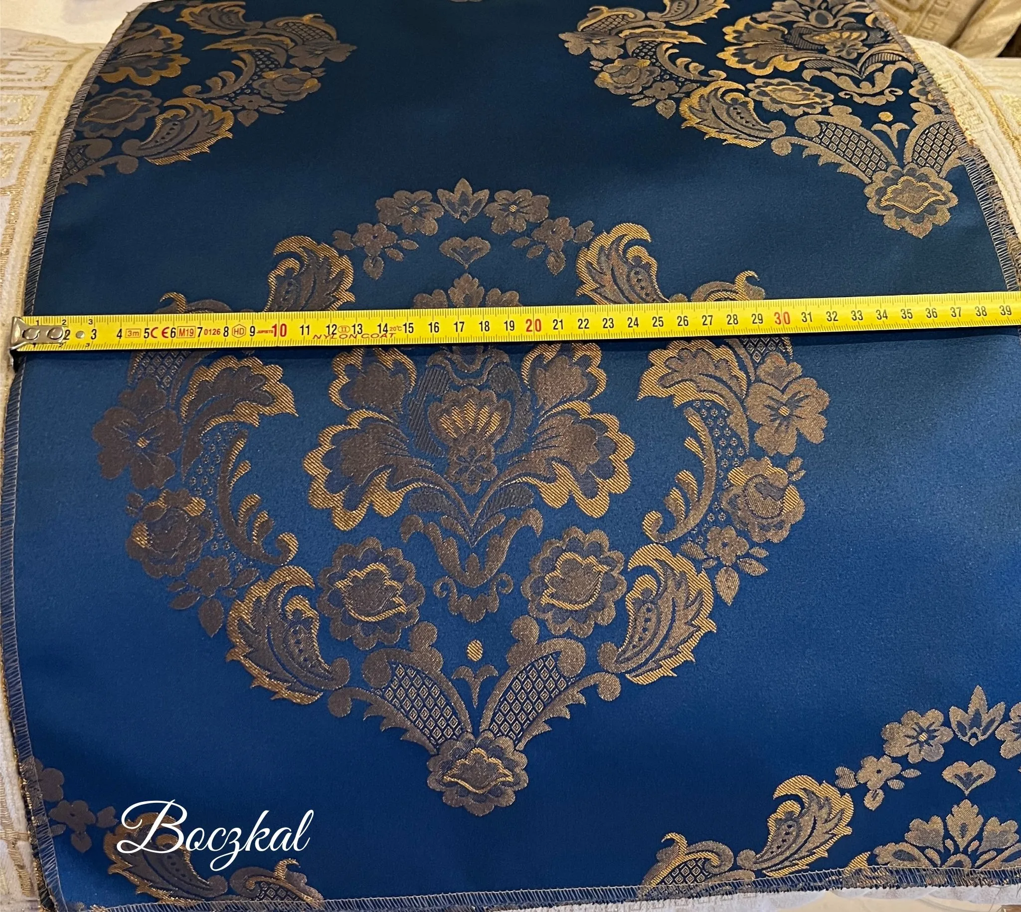 Przedstawiony ornament utrzymany jest w tonacji ciemnego złota/mosiądzu, który mieniąc się podkreśla elegancję i ponadczasowe piękno tej tkaniny.