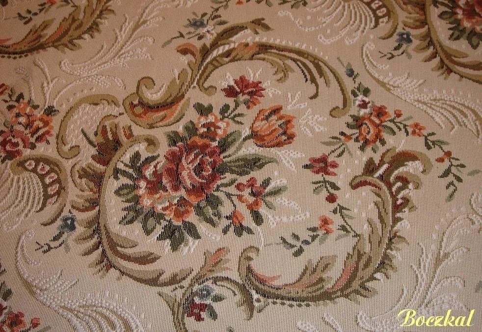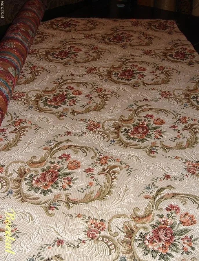 Oryginalna tkanina żakardowa o charakterystycznym skośnym splocie włókien, przedstawiająca piękny motyw najczęściej kwiatowy.