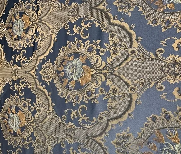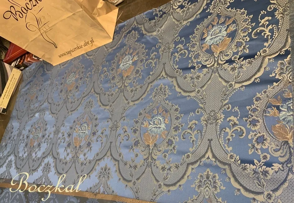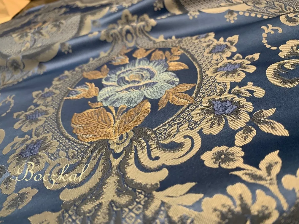 Tkanina jest bardzo elegancka. Spód tkaniny to mocny również tkany żakard, natomiast sam ornament jest żakardowy płasko odszyty na tle satynowo-żakrdowym granacie.