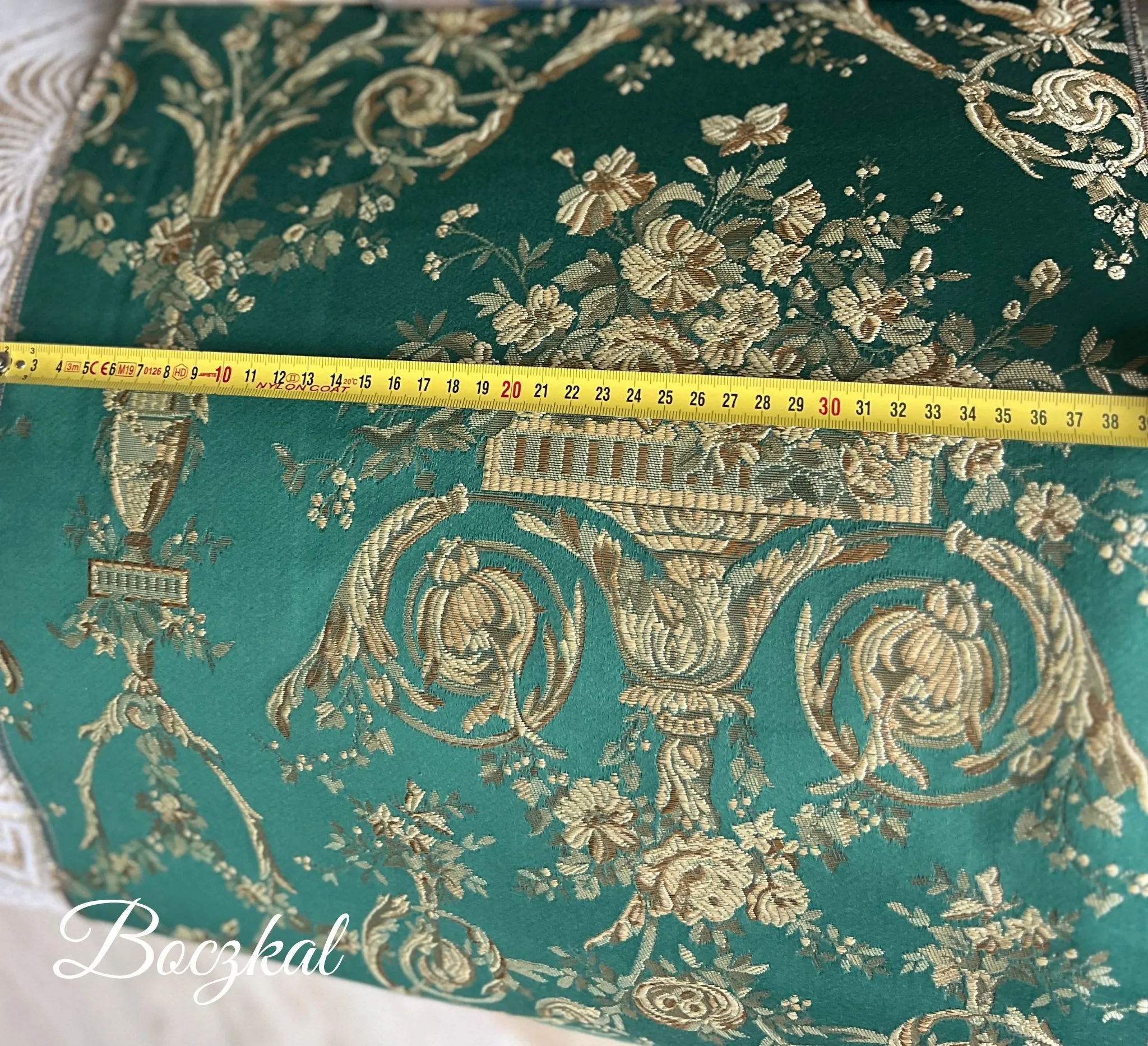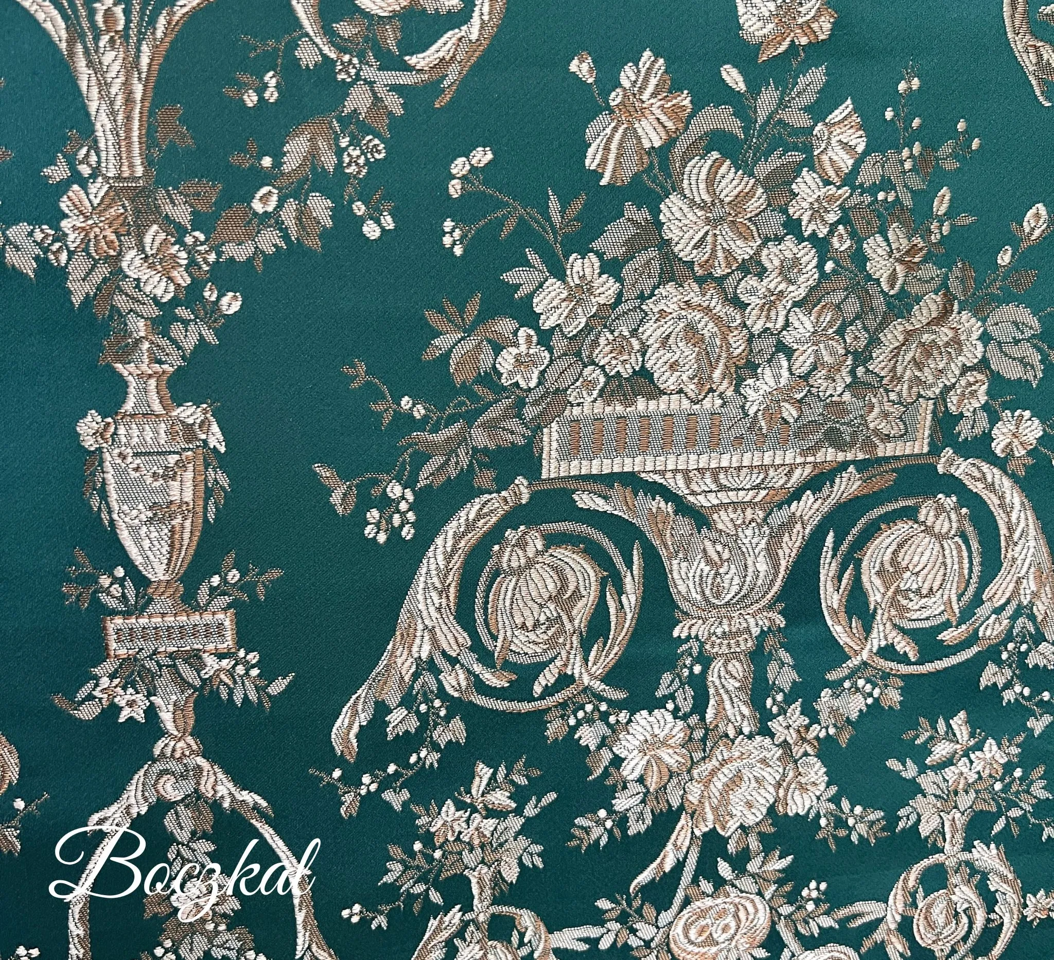 Piękna tkanina obiciowa , która emanuje arystokratycznym wdziękiem i ponadczasową poezją wzoru. Na tle głębokiej, szmaragdowo-zielonej tafli rozkwita misterna symfonia złotych nici, które układają się w kwieciste girlandy, wazy pełne wonnych bukietów i fantazyjne arabeski o subtelnym połysku. Każdy detal zdaje się być muśnięciem pędzla mistrza – delikatny, precyzyjny, pełen wdzięku i harmonii układ stylowych bukietów kwiatowych