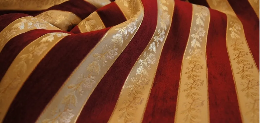 Piękna i elegancka tkanina stylowa, zachywcająca pięknym blaskiem mieniących się pasów w kolorze czerwieni wina oraz jasnego złotego ecri. Tkanina składa się z niezwykle eleganckich pasów żakardowych oraz pasów z szenili. Połączenie tych dwóch rodzajów tkanin sprawia, że tkanina podczas dotyku jest miękka , natomiast wstawki pasów żakardowych powoduja, że tkanina wyglada niezwykle ciekawie.