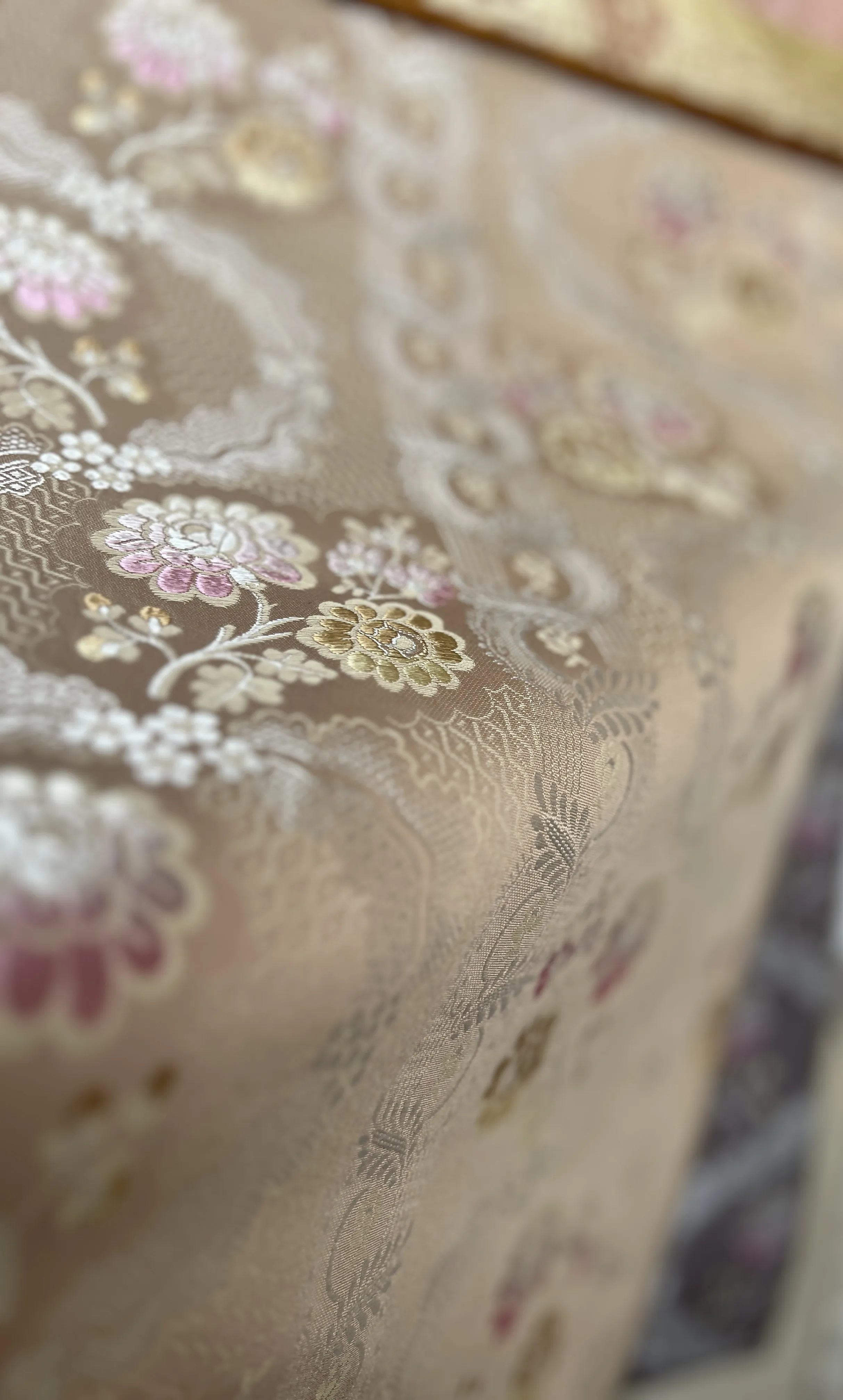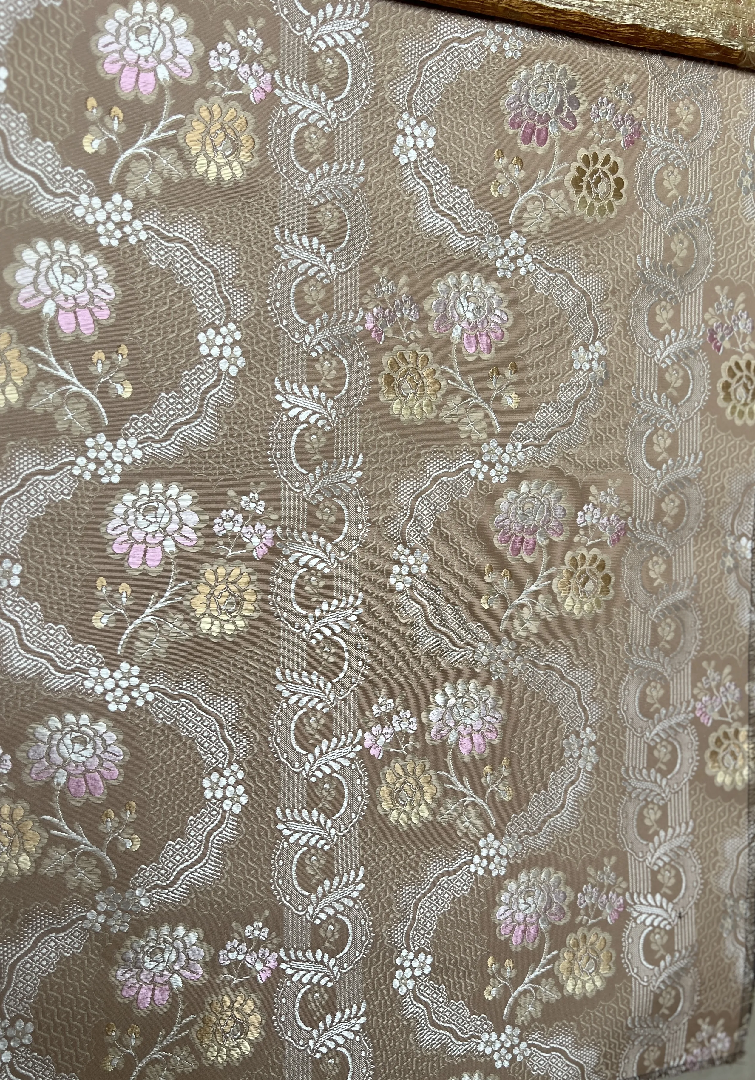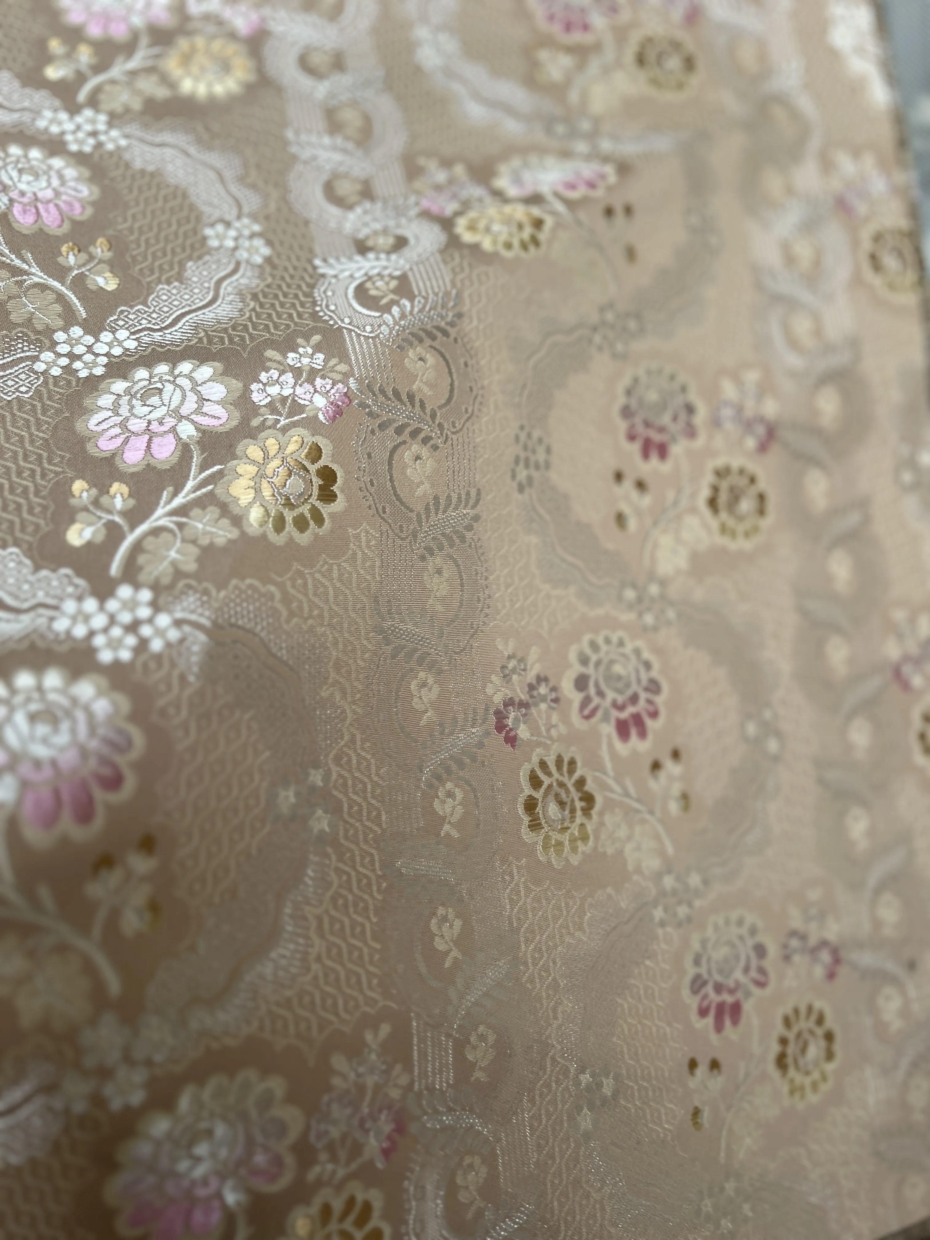 Na powierzchni tkaniny rozkwitają pastelowe kwiaty — różowe, waniliowe i złociste — ujęte w lekkie, falujące wstęgi, które zdają się płynąć niczym spokojna melodia klawesynu. Wzory utkane srebrzystą nicią dodają całości szlachetnego blasku, tworząc efekt pełen harmonii i wyrafinowania.